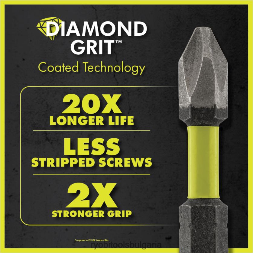 допълнете своята колекция от инструменти с технология ryobi с диамантено покритие. 6 бр. 2-инчови ударни задвижващи накрайници с диамантено зърно предлагат първокласно решение за задвижване. диамантено зърно втвърдява върха за подобрена издръжливост и 20 пъти по-дълъг живот. диамантените песъчинки се придържат здраво към закопчалката за контрол преди шофиране и 2 пъти по-силен захват. диамантеното зърно също подобрява прилягането и захваща закопчалката по време на задвижване за по-малко оголени винтове. включената щипка за колан осигурява преносимост и удобство този комплект включва диамантени ph битове: (6) ph2.