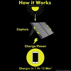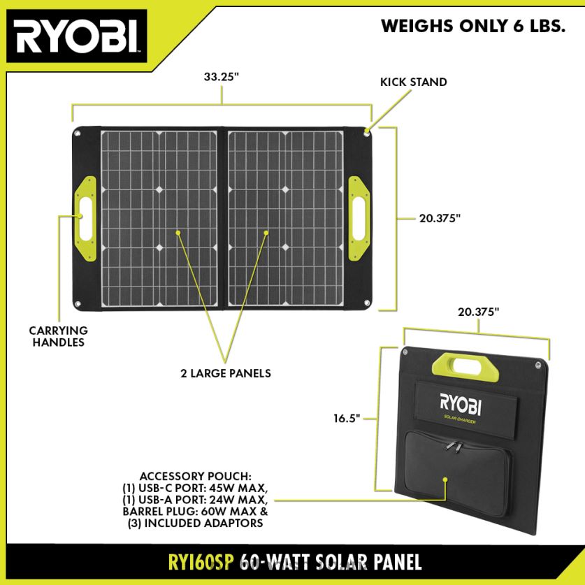сгъваемият слънчев панел ryobi с мощност 60 вата захранва всяко малко електронно устройство с usb-a или usb-c порт директно от слънцето. за допълнителна съвместимост, той захранва и различни други електроники с конектора и адаптерите. той е идеален за захранване на вашите телефони, таблети, захранващи банки, високоговорители и дори батерии ryobi 18v one+, когато се комбинира със съвместим източник на захранване ryobi. сдвоете с електростанцията ryobi 18v one+ ryi818bg, за да заредите до 8 батерии последователно, използвайки слънчева енергия. този слънчев панел може да зареди батерия ryobi 18v one+ 2ah за по-малко от 1 час и телефона ви само за 1 час и 15 минути. компактният, сгъваем дизайн прави съхранението и транспортирането лесно, така че можете да го вземете със себе си, за да зареждате устройства, когато сте на къмпинг, oна работна площадка и навсякъде под слънцето, където имате нужда от преносимо захранване. увеличете максимално количеството светлина, което панелите улавят, като използвате свободно регулируема стойка или (4) сигурни втулки. 60-ватовият соларен панел ryobi е подкрепен от 3-годишна гаранция на производителя на ryobi и включва сгъваем слънчев панел ryi60sp 60 вата, адаптери за щепсели и ръководство за оператора.