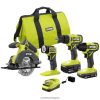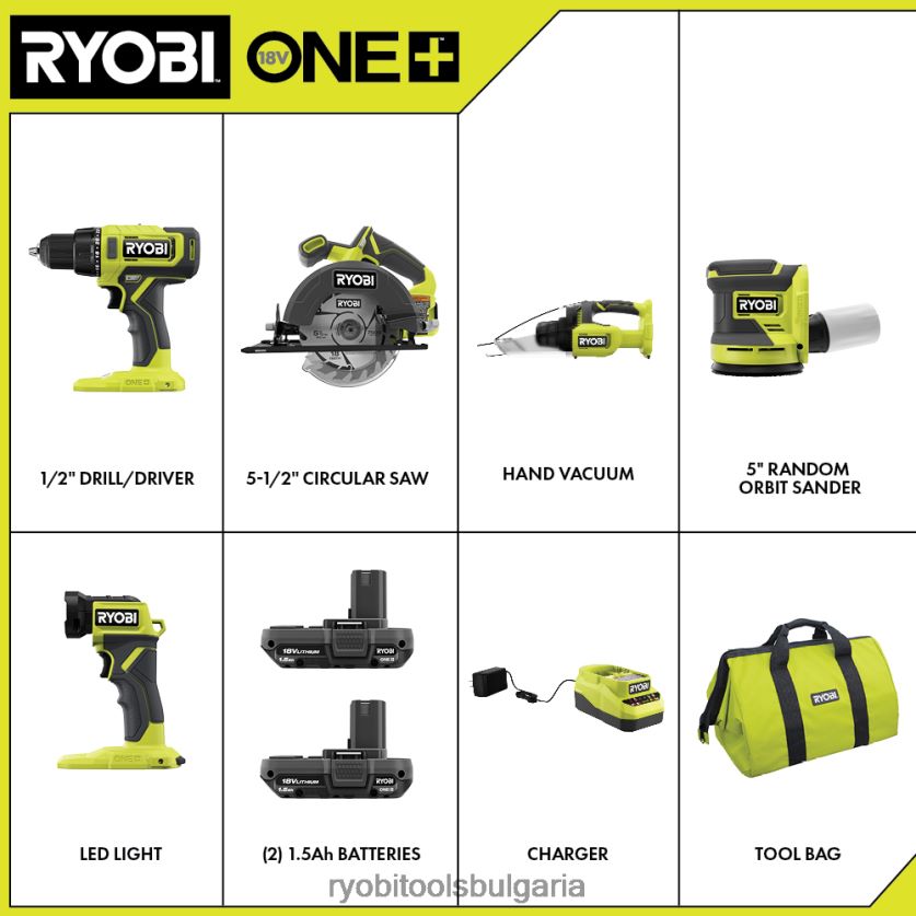 влезте в системата ryobi 18v one+ с комбинирания комплект ryobi 18v one+ с 5 инструмента – 1/2″ бормашина/винтоверт, 5-1/2″ циркулярен трион, ръчен вакуум, случаен орбитална шлайфмашина, LED светлина, (2) литиеви батерии 1.5ah, зарядно устройство и чанта за инструменти. свредлото/винтовертът осигурява до 515 in-lbs. въртящ момент и разполага с 1/2″ метален патронник с тресчотка, който отговаря на вашите нужди при пробиване и задвижване. 5-1/2″ циркулярен трион има способността да реже 2-по материал, с над 215 срязвания на зареждане. Мощното засмукване на ръчната прахосмукачка почиства различни сухи отломки и повърхности и е с възможност за 1-1/4″ аксесоар. Орбиталната шлифовъчна машина създава гладко покритие без завихряне с 10 000 об/мин. Този инструмент също така разполага със закопчаване с кука и примка за бързо приставка за шкурка и вградено събиране на прах за лесно почистване.LED лампата също има 280 лумена светлинен поток и хаs въртяща се на 130 градуса глава за регулируема посока на светлинния лъч. 18v one+ 1.5ah литиеви батерии разполагат с интегриран високо видим индикатор за гориво за наблюдение на оставащото време за работа. зарядното устройство 18v е съвместимо с литиеви батерии ryobi one+. този комбиниран комплект 18v one+5 инструмента е подкрепен от 3-годишната гаранция на производителя на ryobi и включва (1) pcl206 18v one+ 1/2″ бормашина/отвертка, (1) pcl500 18v one+ 5-1/2″ циркулярен трион, ( 1) pcl705 18v една+ ръчна прахосмукачка, (1) pcl406 18v one+ орбитална шлайфмашина, (1) pcl660 18v one+ led светлина, (2) 18v one+ 1.5ah литиеви батерии, (1) pcg002 18v one+зарядно устройство, вакуумен филтър, кръгъл нож за трион, асортимент от шкурка, чанта за инструменти и ръководства за оператора.
