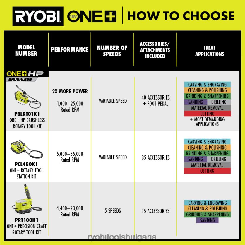 ryobi представя 18v една+ въртяща се инструментална станция. този инструмент осигурява подобрена мощност с променлива скорост на набиране, която позволява на потребителите да избират между 5 000 – 35 000 номинални оборота в минута за завършване на различни проекти. тази въртяща се инструментална станция е и най-тихата в своя клас, което я прави идеална за използване в повечето работни пространства. с 35 включени аксесоара и вградено място за съхранение на аксесоари, въртящата се инструментална станция осигурява удобство, докато изпълнява набор от приложения. 36-инчовият дизайн на писалката с гъвкав вал увеличава максимално прецизността и комфорта. този инструмент включва и новата иновативна цанга за бърза смяна с 4 пъти по-бърза смяна на аксесоари, което прави смяната на аксесоари бърза и лесна. с гумени крачета за намаляване на подхлъзването и интегрирани отвори за окачване, въртящият се инструмент 18v one+ е лесенза използване и лесен за съхранение. подкрепен от 3-годишната гаранция на производителя на ryobi, този ротационен инструмент включва 18v one+ 2ah батерия, 18v one+ зарядно устройство, 36-инчов гъвкав вал, 35 аксесоара за шлайфане/рязане/шлайфане/полиране, кутия за съхранение на аксесоари, гаечен ключ и ръководство за оператора.
