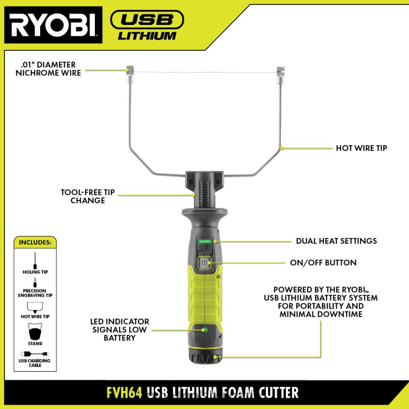 ryobi представя usb комплекта за рязане на литиева пяна. тази резачка за пяна реже, оформя и бръсне различни видове пяна. бързо нагряване за по-малко от 2 минути, този инструмент е готов, когато сте готови. настройките за двойна топлина ви дават прецизен контрол на температурата, който да регулирате според нуждите на вашия проект. този комплект включва 3 различни накрайника за рязане на пяна за различни приложения. накрайникът с гореща тел е идеален за издълбаване, рязане, оформяне на вашата пяна. някои страхотни места за използване на този съвет ще бъдат върху пяна за тапицерия, когато обновявате мебели или оформяте стиропор за проект „направи си сам“. накрайникът за прецизно гравиране добавя текстура или детайл към вашите дизайни. върхът за дупки е идеален за изрязване на различни форми или изкопаване на дупки в стиропор. елиминирайте времето за престой с удобната смяна на върха без инструменти. този дунапрен е съвместим с ryobi 2 бр.комплект за ножове за дунапрен (a81fc07) и резервна нихромова тел (a81fc06) (продава се отделно). сдвоете USB резачката за литиева пяна с хоби станцията ryobi (rhs01) за максимален контрол и прецизност (продава се отделно). този продукт разполага с LED индикатор, който сигнализира, когато инструментът се нагрява, както и показва състоянието на зареждане на батерията. Най-доброто от всичко е, че е част от ryobi usb литиева система от инструменти, която осигурява компактни, преносими и презареждащи се решения за безжично захранване и производителност. комплектът за рязане на usb литиева пяна е подкрепен от 2-годишна гаранция на производителя на ryobi и включва usb литиева 2ah батерия, нихромен проводник, накрайник с горещ проводник, накрайник за прецизно гравиране, накрайник за дупки, стойка, USB кабел и ръководства за оператора и е опакован в твърд калъф за организация и удобство.