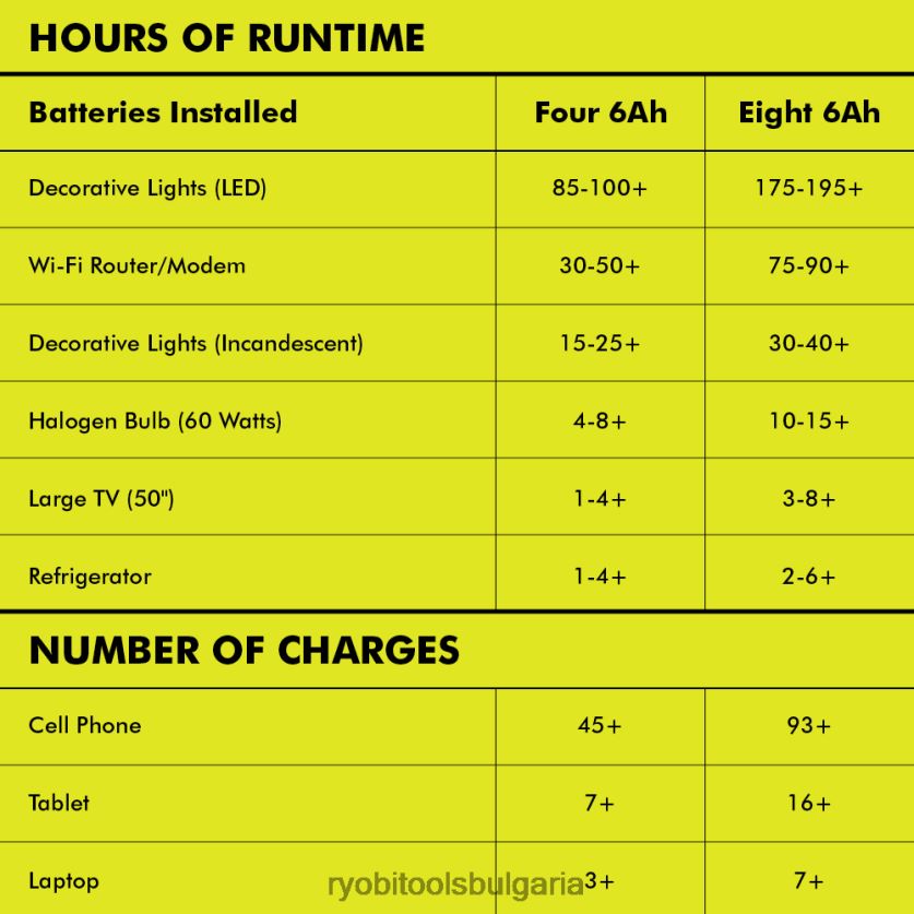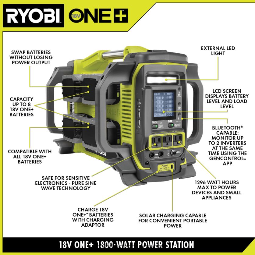 разширете своята система ryobi 18v one+ с 1800-ватовата електроцентрала ryobi 18v one+. независимо дали сте на работната площадка, в пустинята или у дома по време на прекъсване на електрозахранването, тази електроцентрала е перфектна за поддържане на вашите устройства работещи. използвайки батерии 18v one+, това устройство доставя 3000 начални вата и 1800 работни вата за захранване на устройства като мобилни телефони, лаптопи, осветителни тела и дори телевизори и хладилници. използвайки (8) 12ah 18v литиеви батерии, това устройство може да захранва хладилник с пълен размер до 28 часа или 55-инчов LED телевизор за над 14 часа. С тиха работа и нулеви емисии, тази електроцентрала е безопасна за използване на открито и закрито. технологията на чистата синусоида позволява чиста изходна мощност, осигурявайки съвместимост с чувствителна електроника. гореща суаp възможностите ви позволяват да сменяте батериите без прекъсване на захранването. тази електроцентрала също така разполага с 60-ватов usb-c порт за зареждане, което ви позволява да зареждате 8 батерии последователно чрез зарядно за стена, адаптер за кола или дори от слънчев панел. наблюдавайте и контролирайте вашата електроцентрала дистанционно с помощта на приложението ryobi gencontrol, което показва изходна мощност, ниво на батерията и др. Най-доброто от всичко е, че е част от системата ryobi one+, където всяка батерия 18v one+ работи с всеки продукт 18v one+. тази 18v one+ 1800-ватова електроцентрала е подкрепена от 3-годишната гаранция на производителя на ryobi и включва ryi818bt 18v one+ електростанция, защитно покритие, адаптер за зарядно устройство, usb-c кабел и ръководство за оператора. батерията и зарядното се продават отделно.