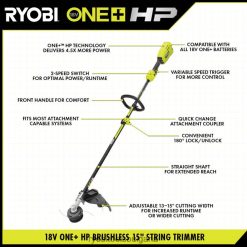безчетковият 15″ тример с възможност за приставка ryobi 18v one+ hp е най-добрата комбинация от мощност и гъвкавост .има безчетков мотор за максимална мощност и издръжливост.възможността за разширяване на приставката ви позволява да трансформирате вашия тример в машина за кантиране, духалка, трион и много други инструменти с наличните приставки, което означава, че можете да спестите време, място и пари. този тример е оборудван с макара easy+ bump подаваща глава с манивела за навиване на скорост, която може да се презарежда за 60 секунди или по-малко. Спусъкът с променлива скорост и превключвателят с 2 скорости осигуряват по-голям контрол за всяко приложение. регулируемите 13″ до 15 ” Ширината на рязане ви позволява да оптимизирате вашия тример за увеличеновреме на работа или по-широка ширина на рязане. този лек и добре балансиран дизайн също има предна ръкохватка за комфорт, а тримерът е оборудван с 6,0 ah батерия за удължено време на работа. батерията е съвместима със системата ryobi one+. подкрепено с 3 години гаранция.