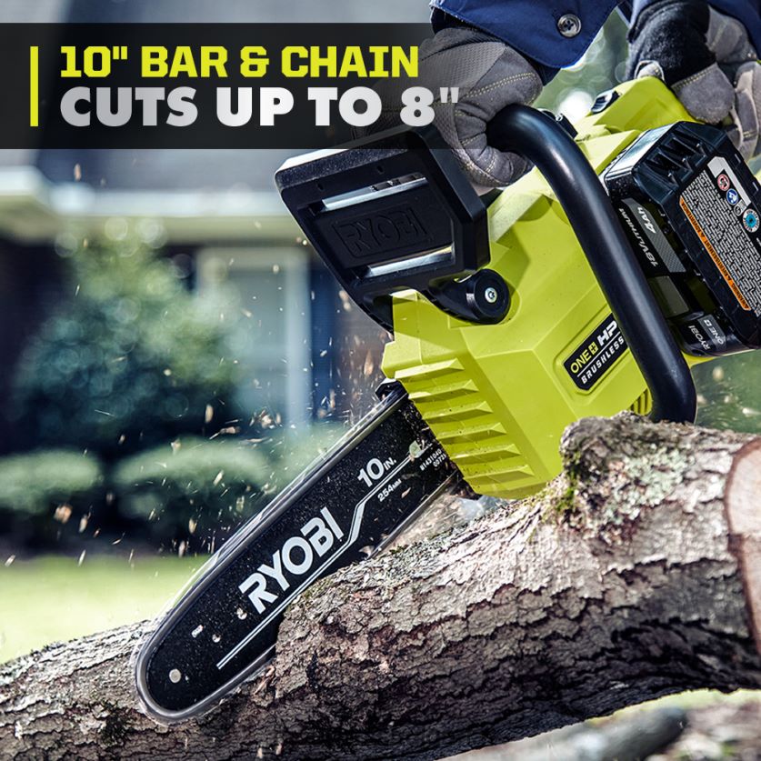 подобрете вашата система ryobi 18v one+ с безчетковия комплект 10” резачка 18v one+ hp. Технологията one+ hp съчетава безчетков двигател, усъвършенствана електроника и високопроизводителна литиева технология, за да осигури 85% по-бързо рязане. този моторен трион прави до 70 среза с едно зареждане с включената литиево-йонна батерия от 4 ah. изпитайте изключителна производителност само с натискане на спусъка, без да се налага газ или акорди. 10-инчовата шина и веригата могат да се справят с до 8-инчови срезове, идеални за подрязване и подрязване. този инструмент разполага с бутон за смазване за лесно освобождаване на маслото от веригата. съвместим с резервна верига ry10c1 10” и не забравяйте вашата лубрикант за шина и верига rybio24. Най-доброто от всичко е, че е част от системата ryobi one+, където всяка батерия 18v one+ работи с всеки продукт 18v one+. това 18v one+ hp безчетков 10-инчов верижен трион е подкрепен от 3-годишна гаранция от производителя на ryobi и включва батерия 18v 4ah, зарядно устройство 18v, комбиниран гаечен ключ, ножница и ръководства за оператора.