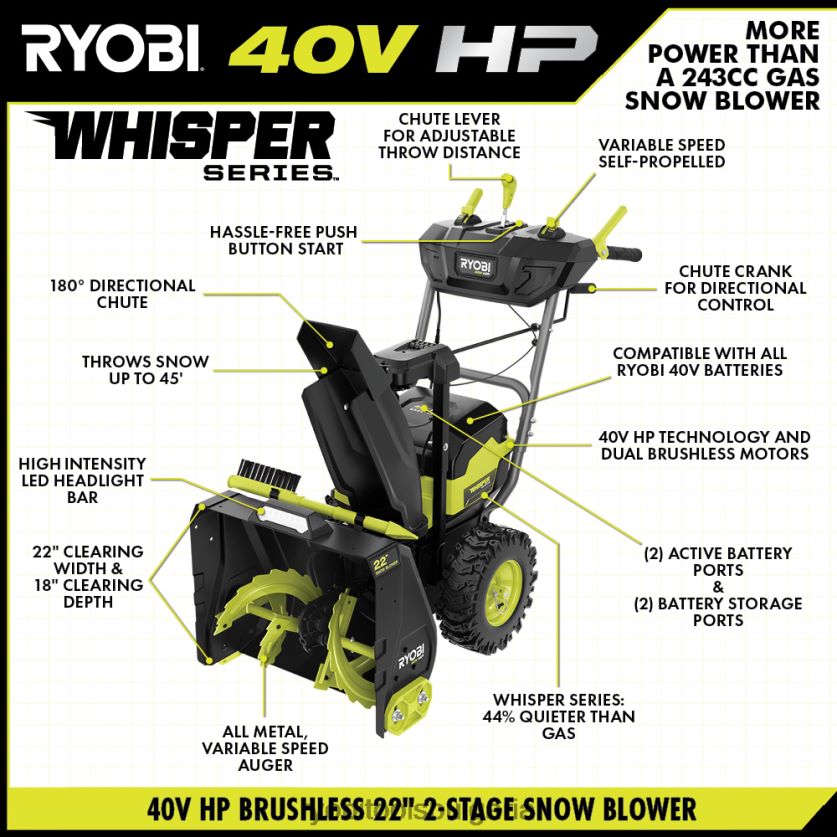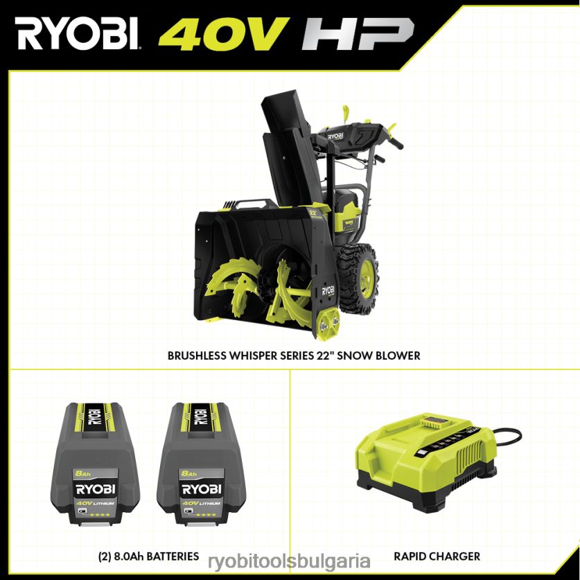 подобрете вашата система ryobi 40v с комплекта безчетков 22-инчов снегорин ryobi 40v hp. Технологията 40v hp съчетава безчетков двигател, усъвършенствана електроника и високопроизводителна литиева технология, за да достави повече мощност от 243cc газов снегорин, което го прави истински заместител на газа. мощният мотор изхвърля сняг на разстояние до 45′ и осигурява до 30 минути работа с помощта на (2) включени батерии 40v 8ah, достатъчни за почистване на до 20 автомобилни места от сняг. този снегорин от серията whisper е проектиран да бъде 44% по-тих от газовия и дори по-тих от другите безжични снегорини, което ви позволява да работите по всяко време на деня, без да безпокоите другите. ширината на почистване от 22 инча и дълбочината на почистване от 18 инча правят този снегорин идеален за големи тротоари и алеи. разполага с променлива скоростсамоходна задвижваща система, за да завършите работата бързо и без усилие. за по-голям контрол и издръжливост, снегорината разполага и с изцяло стоманен шнек с променлива скорост и 180-градусов насочващ улей за насочване на посоката на хвърляне на сняг. Най-доброто от всичко е, че е част от системата ryobi 40v, където всяка 40v батерия работи с всеки 40v продукт. този 40v к.с. безчетков комплект 22″ снегорин е подкрепен от 5-годишна гаранция на инструмента от производителя на ryobi, 3-годишна гаранция за батерията от производителя и включва ry408150 40v безчетков 22″ снегорин, (2) op4080a 40v 8ah батерии, 40v бързо зарядно устройство , инструмент за почистване, комплект горна ръкохватка, комплект улей, монтаж на манивела на улея и ръководства за оператора.