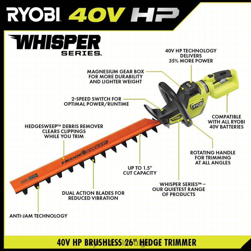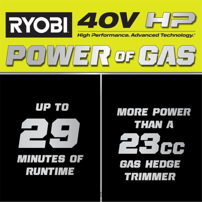 подобрете вашата 40v система с комплекта 40v hp 26” тример за жив плет. Технологията 40v к.с. осигурява повече мощност от 23cc газова ножица за жив плет, без проблемите с газ или кабели. използвайки включената батерия 40v 2ah, ще постигнете до 29 минути работа. Технологията 40v съчетава усъвършенствана електроника с безчетков двигател и високоефективна литиева технология с 26″ остриета и впечатляващ капацитет на рязане от 1″ за лесно справяне с дебели живи плетове. Технологията против засядане предотвратява засядането на остриетата в клоните, докато остриетата с двойно действие мощност през жив плет с намалени вибрации и по-малко умора. този тример от серия whisper е проектиран да бъде 72% по-тих от газовите и дори по-тих от другите акумулаторни ножици за жив плет. магнезиевата скоростна кутия увеличава дуратаспособност и прави ножицата за жив плет по-лека. въртящата се дръжка ви позволява удобно да подрязвате живи плетове и храсти под всички ъгли, докато устройството за премахване на остатъци от жив плет улеснява почистването на изрезките, докато подрязвате. превключвателят с 2 скорости ви позволява да избирате между две скорости на рязане, за да увеличите максимално мощността или да оптимизирате времето за работа. Най-доброто от всичко е, че е част от системата ryobi 40v, където всяка 40v батерия работи с всеки 40v продукт. тази ножица за жив плет 40v hp е подкрепена от 5-годишна гаранция от производителя на ryobi, а включената батерия е подкрепена от 3-годишна гаранция за батерията от ryobi. този комплект включва ножица за жив плет ry40606 40v, литиева батерия op40204 40v 2ah, устройство за бързо зареждане op406 40v, устройство за почистване на отпадъци от жив плет, ножница и ръководства за оператора.