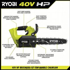 влезте в системата ryobi 40v с комплекта верижен трион 40v hp без четки с 12″ горна ръкохватка. Технологията 40v hp осигурява повече мощност от 31cc газов трион, което прави това истински заместител на газ.този верижен трион получава до 129 срязвания с едно зареждане и е оборудван с първокласна пълна верига.Технология 40v к.с. комбинира безчетков мотор, усъвършенствана електроника и високоефективна литиева технология, за да осигури повече мощност, време на работа, по-бързо рязане, и издръжливост. с 12″ шина и верига и дизайн на горната ръкохватка, този верижен трион е идеален за правене на висококачествени резитби с повишен контрол и маневреност. Регулируемият автоматичен гресьор поддържа веригата постоянно смазана за по-дълъг живот на веригата. плюс, добавената верижна спирачка осигурява защита от откат от stoпинг на веригата автоматично. регулирайте веригата си за контролирани, чисти срезове с помощта на инструментално опъване на веригата с вградено съхранение на инструменти. презаредете своята 40v 4ah батерия за по-малко от 60 минути с включеното 40v бързо зарядно устройство. Най-доброто от всичко е, че е част от системата ryobi 40v, където всяка 40v батерия работи с всеки 40v продукт. този 40v к.с. безчетков 12-инчов комплект верижен трион с горна ръкохватка е подкрепен от 5-годишна гаранция на инструмента от производителя на ryobi, 3-годишна гаранция за батерията от производителя и включва ry40509 40v к.с. 40v бързо зарядно устройство, ножница, комбиниран гаечен ключ, куфар за носене и ръководства за оператора.