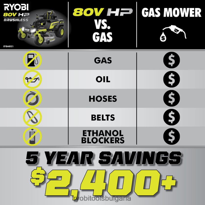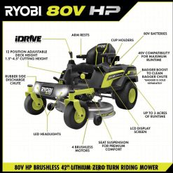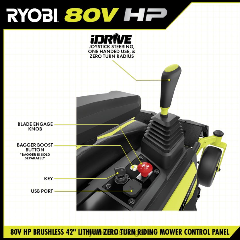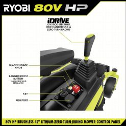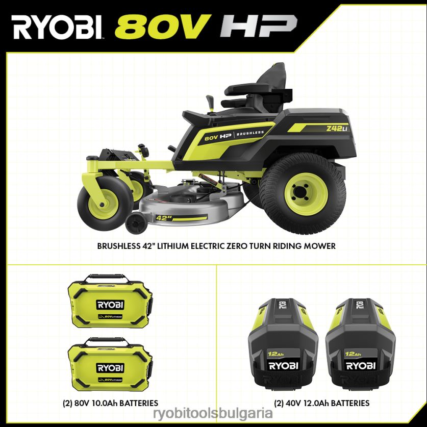 представяме първата литиево-йонна батерия на ryobi, захранвана с нулев оборот, ryobi 80v hp 42″ литиево-електрическа ztr. hp технология и 80v батерии се комбинират, за да осигурят мощност, еквивалентна на 31 конски сили на газ двигател*, като същевременно елиминира неприятностите на газовата косачка. този ездач коси до 3 акра с едно зареждане с 4 безчеткови мотора, (2) 80v 10ah батерии и (2) 40v 12ah батерии, с хипер зарядно устройство, което се зарежда напълно за 2,5 часа, за да сте готови за следващата си работа революционната система idrive използва интуитивен джойстик за управление с една ръка, за да маневрира около обекти по-лесно от традиционния ztr иновативният LCD екран показва времето за работа, живота на батерията и други, докато карате приложението за косачка ви позволява да наблюдавате дистанционно времето за зареждане и живота на батерията. тази косачка за яздене разполага с cross cut система с множество остриета, осигуряваща превъзходна производителност на рязане и мулчиране и 12-точкова настройка на височината за избор на перфектната височина на косене между 1,5″ и 4,5″. тази косачка продължава да е водеща в иновациите със съвместимия аксесоар за усилване на торбичката, който бързо изчиства улея с натискане на бутон, а гуменият страничен изпускателен улей улеснява маневрирането около озеленяване. проектирана с мисъл за удобство, тази косачка разполага с първокласно окачване на седалката, 2 USB порта за зареждане на телефони, отделение за съхранение и светодиодни фарове. мобилна услуга, налична в избрани региони. ако вашата косачка изисква внимание, сертифициран техник за поддръжка на ryobi може да извърши диагностика и обслужване направо от дома ви. някои услуги може да изискват да занесете косачката си в един от над 300-те сервизни центъра в цялата страна. поддръжката на тревата никога няма да бъде същата благодарение на безчетковата 42-инчова литиева електрическа косачка с нулев оборот ryobi 80v hp.