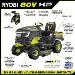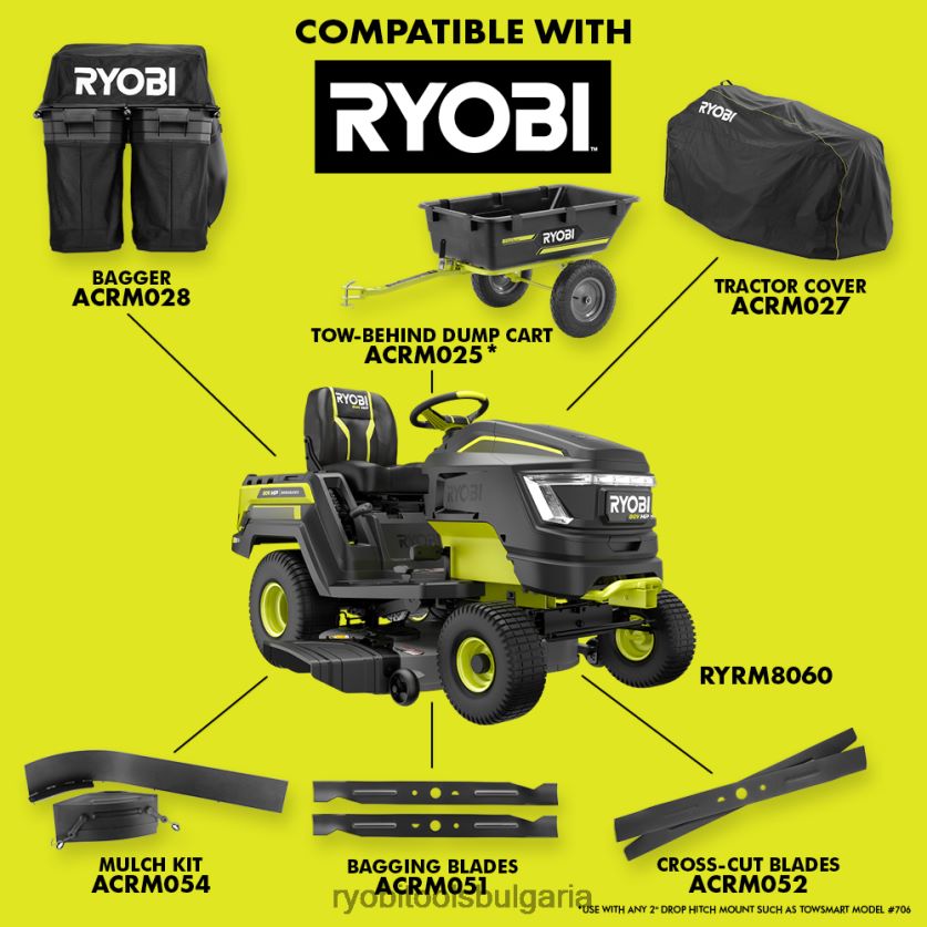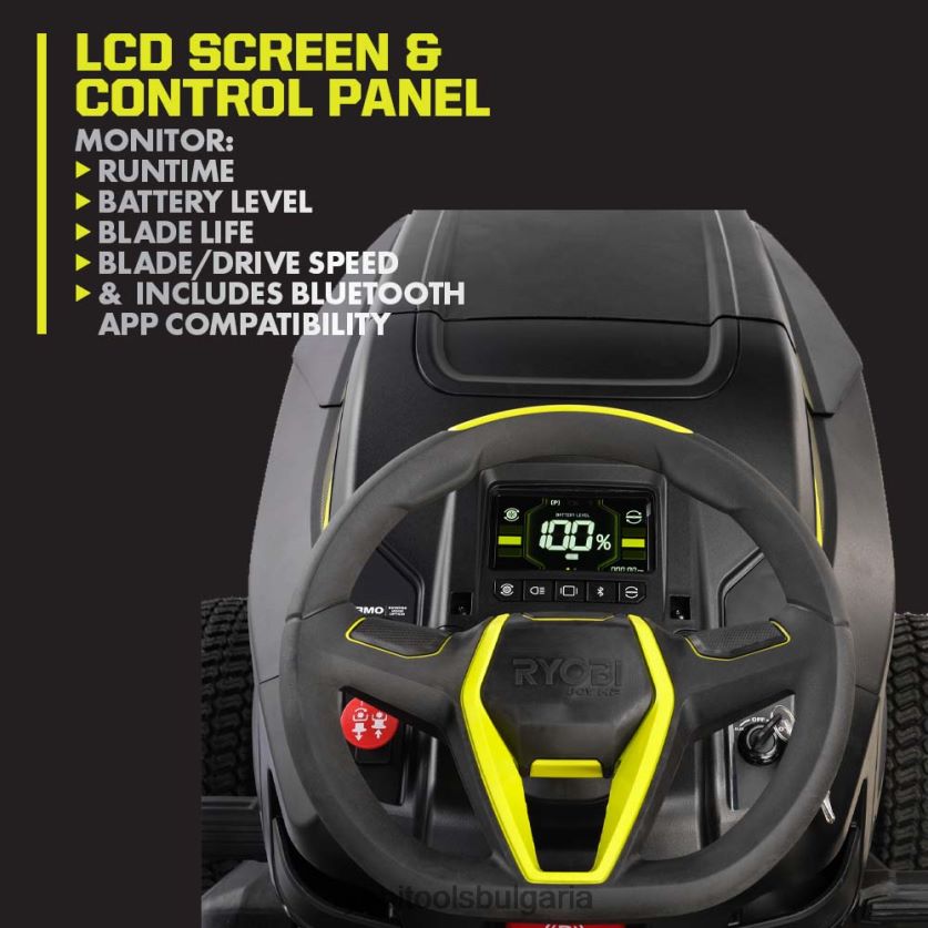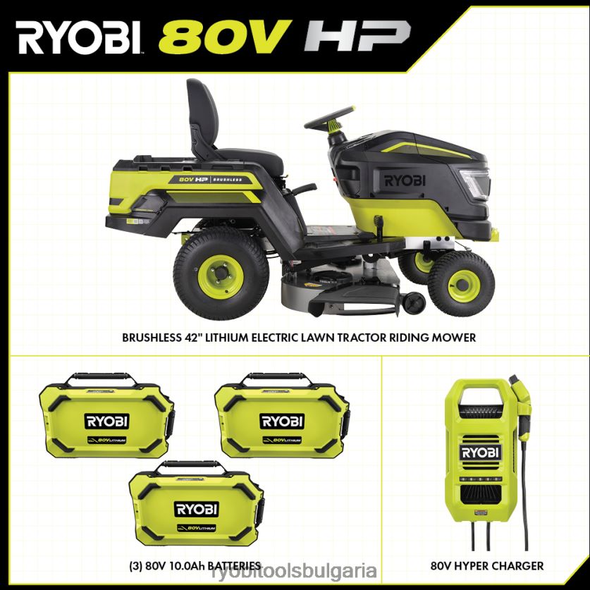 представяме първия трактор за тревни площи на ryobi, захранван с литиево-йонни батерии, ryobi 80v hp 42″ литиев електрически ездач трактор за трева. Технологията 80v к.с. съчетава безчеткови двигатели, усъвършенствана електроника и литиево-йонни батерии, за да достави мощност, еквивалентна на газов двигател с 21 конски сили*, доставяйки цялата мощност, без газ, поддръжка на двигателя и значително по-малко шум. този трактор е захранван от 3 безчеткови мотора и 3 батерии 80v 10ah за косене на до 2 акра с едно зареждане. когато работата е свършена, тракторът се презарежда напълно за по-малко от 2,5 часа с включеното хипер зарядно устройство и порт за зареждане на борда. най-гъвкавото каране тракторът за трева в индустрията разполага с предни и задни отделения за съхранениемъкнете мулч, трупи, растения или всякакъв материал из двора. правят бърза работа по теглене, с капацитет от 500 lbs. и универсален 2″ квадратен теглич в предната и задната част на трактора. Тракторът е оборудван с изработен стоманен дек с тежка натовареност 10 и система с много остриета с напречно рязане, която използва 4 стоманени остриета за постигане на превъзходно рязане. премахнете палубата за по-малко от 90 секунди за бърза поддръжка на острието пълноцветният LCD екран с подсветка показва времето на работа, нивото на батерията и състоянието на заряда, докато приложението за косачка ryobi ви позволява да наблюдавате състоянието на заряда си от телефона си мобилната услуга е достъпна в избрани региони .ако вашата косачка изисква внимание, сертифициран техник за поддръжка на ryobi може да диагностицира и обслужи направо от дома ви.Някои услуги може да изискват да занесете косачката си в един от над 300-те сервизни центъра в цялата страна.този трактор е с гордост произведен в САЩ с материали с глобален произход и има 5-годишна ограничена гаранция.