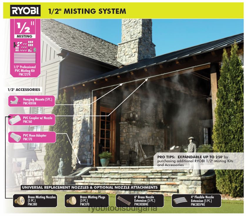 комплектите и аксесоарите за мъгла ryobi са най-лесният и ефективен начин да осигурите прохладната и удобна среда, която искате. професионалният PVC комплект за мъгла ryobi 1/2 инча x 12 фута осигурява 12 фута незабавно охлаждане за вашата външна жилищна зона и лесно се свързва към стандартен градински маркуч. ако желаете повече от 12 фута покритие, този комплект може да бъде разширен до 250 фута със закупуването на допълнителни аксесоари за максимален комфорт в тези горещи дни. този комплект заедно с всички други комплекти и аксесоари за мъгла на ryobi е предназначен за употреба на открито само със студена вода.