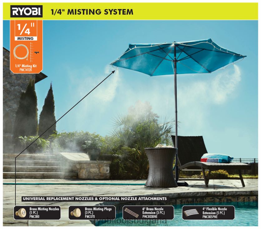 комплектите и аксесоарите за мъгла ryobi са най-лесният и ефективен начин да осигурите прохладната и удобна среда, която искате. ryobi 1/4 инча x 12 фута. комплектът за мъгла ще ви помогне да се борите с топлината с фина охлаждаща мъгла във вашите малки зони за отдих на открито. този комплект се настройва за минути с включените алигаторни скоби или полупостоянни висящи стойки и предлага постоянно охлаждане, когато се прикрепи лесно към стандартен градински маркуч. този комплект заедно с всички други комплекти и аксесоари за мъгла на ryobi е предназначен за употреба на открито само със студена вода.
