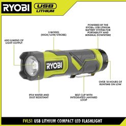 ryobi представя usb литиево компактно LED фенерче. с до 600 лумена светлинен поток и 3 светлинни режима, това фенерче осигурява ярка, ярка светлина, като същевременно запазва издръжлив и компактен дизайн. това фенерче осигурява 18 часа работа и е идеалното решение за тъмни затворени работни пространства, нощни развлекателни дейности или извънредни ситуации. с рейтинг ip54 за устойчивост на вода и прах, тази лампа е създадена да издържа дори на най-трудните условия. комплектът USB литиево компактно светодиодно фенерче е част от USB литиевата система, която осигурява компактни, преносими, презареждащи се решения за безжично захранване и производителност. този комплект usb литиево led фенерче е подкрепено от 2-годишна гаранция на производителя на ryobi и включва (1) fvl51 компактно led фенерче, (1) fvb01 usb литиево 2ah battery, usb кабел и ръководства за оператора.