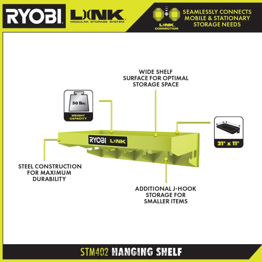 модулната система за съхранение на ryobi link революционизира индустрията за съхранение, като ви позволява да организирате, осъществявате достъп и транспортирате живота си. висящият рафт ryobi link е проектиран да увеличи максимално вашето пространство за съхранение. широката рафтова повърхност и 6 j-образни куки позволяват максимална организация в тесни пространства. стоманената конструкция позволява капацитет на тегло от 50 lb. Най-доброто от всичко е, че е част от линията модулни системи за съхранение на ryobi link, които използват същата заключваща технология. притежавайте вашето пространство с модулна система за съхранение ryobi link.