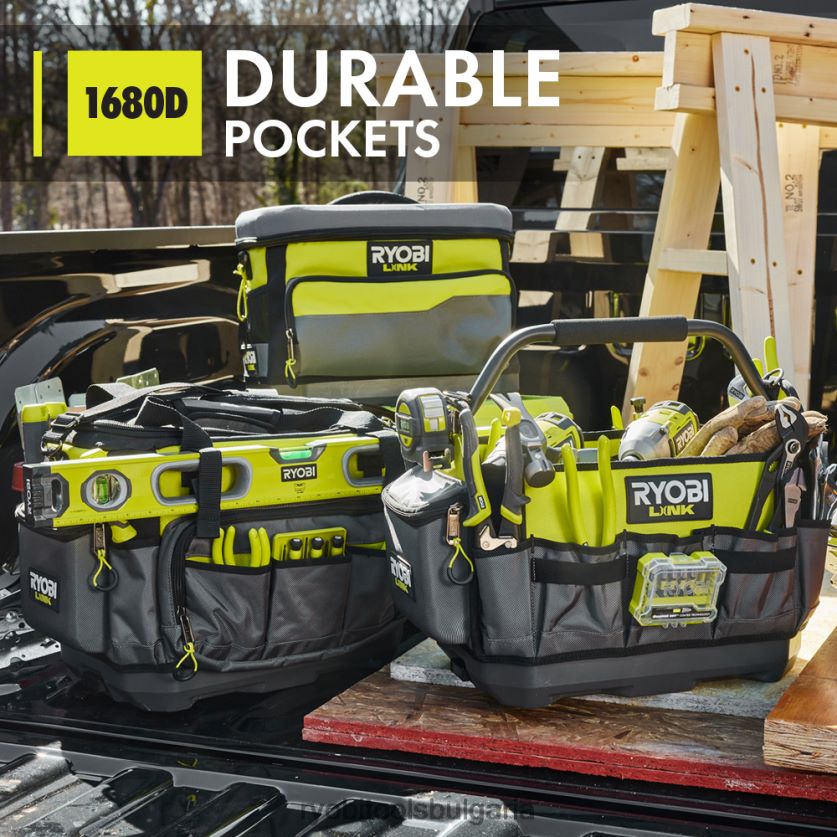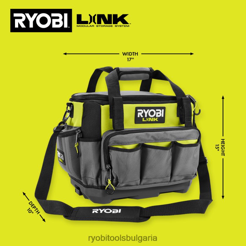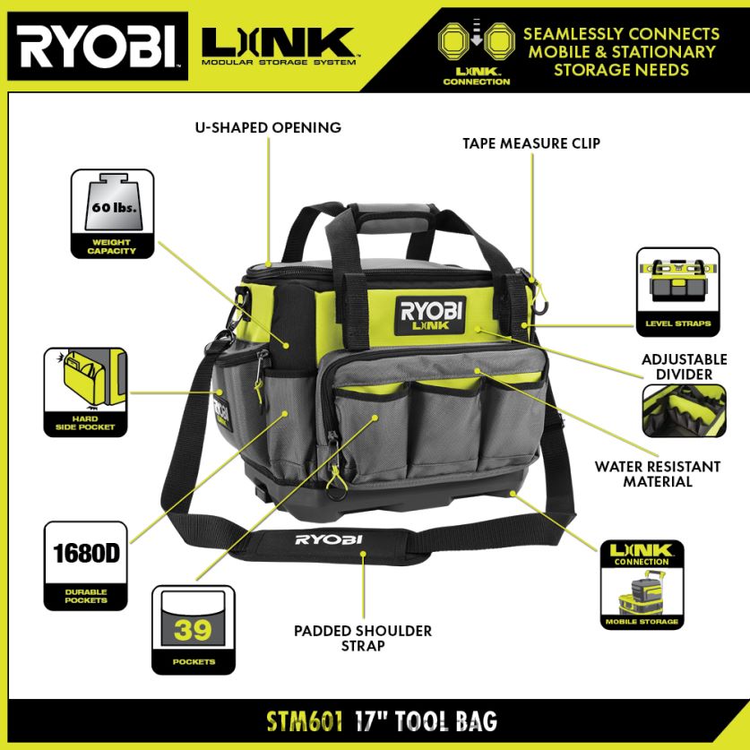 модулната система за съхранение ryobi link революционизира индустрията за съхранение, позволявайки ви да организирате, осъществявате достъп и да транспортирате живота си. 17-инчовата чанта за инструменти ryobi link е проектирана да се справя и с най-трудните ситуации. Капацитетът на тегло от 60 lb., тежките джобове 1680d и водоустойчивият материал пазят вашите инструменти защитени при транспортиране. Организацията е безкрайна с 39 вътрешни джоба и регулируем разделител. твърдият страничен джоб осигурява допълнителна защита за телефони или очила, докато интегрираните ленти за ниво и щипката за рулетка поддържат тези предмети лесно достъпни Носете с помощта на горната дръжка или с включената подплатена презрамка U-образният отвор осигурява максимален капацитет за съхранение и подобрено изживяване за преглед на цялото съдържание без ровенепреди всичко, той е част от продуктовата гама модулна система за съхранение на ryobi link, която използва една и съща заключваща технология за безпроблемно свързване на вашите нужди за мобилно и стационарно съхранение. притежавайте вашето пространство с модулна система за съхранение ryobi link.