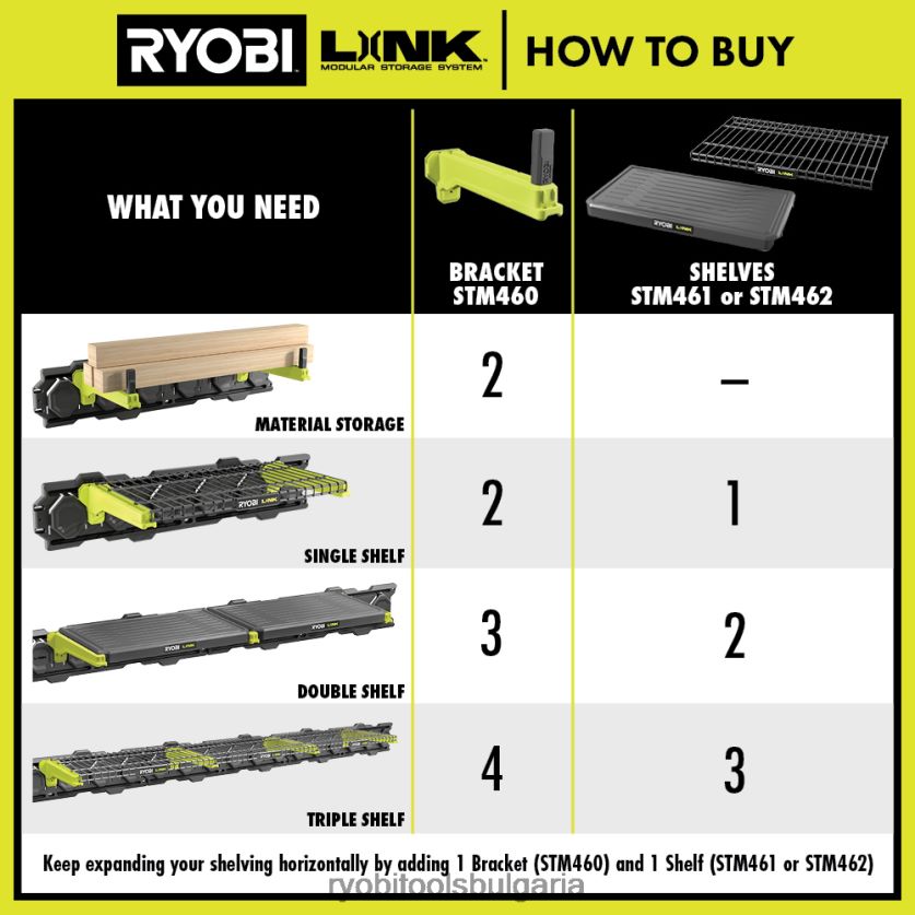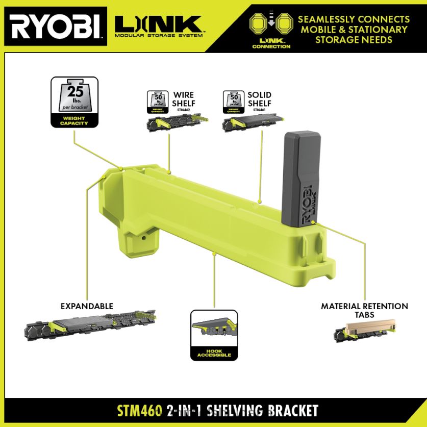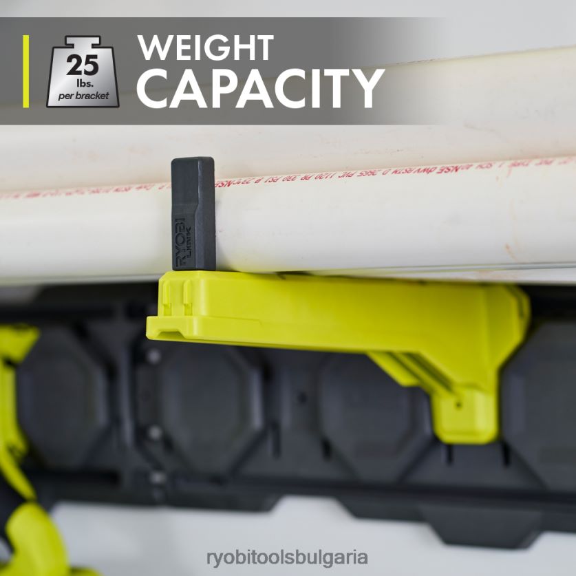 модулната система за съхранение ryobi link революционизира индустрията за съхранение, позволявайки ви да организирате, осъществявате достъп и да транспортирате живота си. скобата за рафтове ryobi link 2-в-1 е предназначена за съхранение на дълги строителни материали или за трансформиране в рафт. използвайте зъбците за задържане на материала, за да държите сигурно pvc, дървен материал, дюбели, пръти и т.н. или сдвоете скоби с 21-инчов масивен рафт или 21-инчов теленен рафт. използвайте две скоби 2 в 1, за да държите един рафт, или добавете трета скоба, за да държите два рафта един до друг, споделяйки средната скоба. продължете да разширявате вашата рафтова система, като добавите една допълнителна скоба и рафт в един ред. най-доброто от всичко е, че е част от продуктовата линия модулна система за съхранение на ryobi link, която използва същата заключваща технология за безпроблемно свързване на вашия мподвижни и стационарни нужди за съхранение. притежавайте вашето пространство с модулна система за съхранение ryobi link.