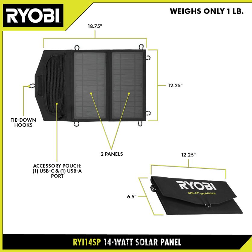 14-ватовият сгъваем соларен панел ryobi захранва всяко малко електронно устройство с usb-a или usb-c порт директно от слънцето. той е идеален за захранване на вашите телефони, таблети, захранващи банки, високоговорители и дори батерии ryobi 18v one+, когато се комбинира със съвместим източник на захранване ryobi. може да зареди батерия ryobi 18v one+ 2ah за по-малко от 4 часа, а телефона ви само за 2 часа и 20 минути. 14-ватовият слънчев панел увеличава преносимостта на вашия източник на енергия, тежи само 1 паунд и е с размери 12,15”x 6,5” в сгънато състояние. компактният, лек, сгъваем дизайн прави съхранението и транспортирането лесно, така че можете да го вземете със себе си, за да зареждате устройства по време на туризъм, къмпинг, на плажа и навсякъде под слънцето, където имате нужда от преносимо захранване. може да бъде опепоставена на земята, за да улавя светлина по време на пиковите слънчеви часове, или може да бъде нанизана под различни ъгли с помощта на (7) интегрирани халки за окачване, за да се увеличи максимално количеството светлина, което улавя. 14-ватовият соларен панел ryobi е подкрепен от 3-годишна гаранция на производителя на ryobi и включва сгъваем слънчев панел ryi14sp 14 вата и ръководство за експлоатация.
