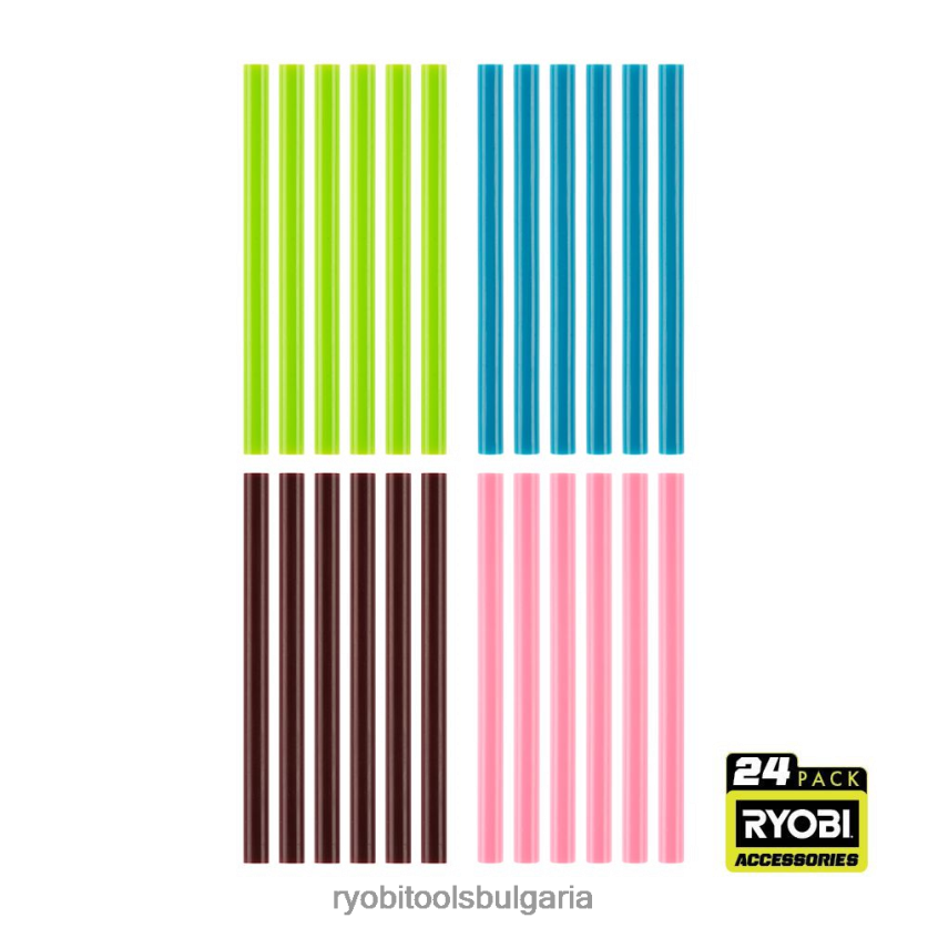 комплектът от 24 опаковки мини цветни лепилни пръчици ryobi е перфектен за използване върху дърво, пластмаси, керамика, тъкани, картон , и различни тъкани. възможността за двойно топене ви подготвя за различни приложения. за най-добри резултати винаги съчетавайте вашите инструменти ryobi с аксесоари ryobi. ryobi a1932410 включва 6 розови, 6 синьозелени, 6 лайм зелени и 6 кестеняви мини лепилни пръчици.