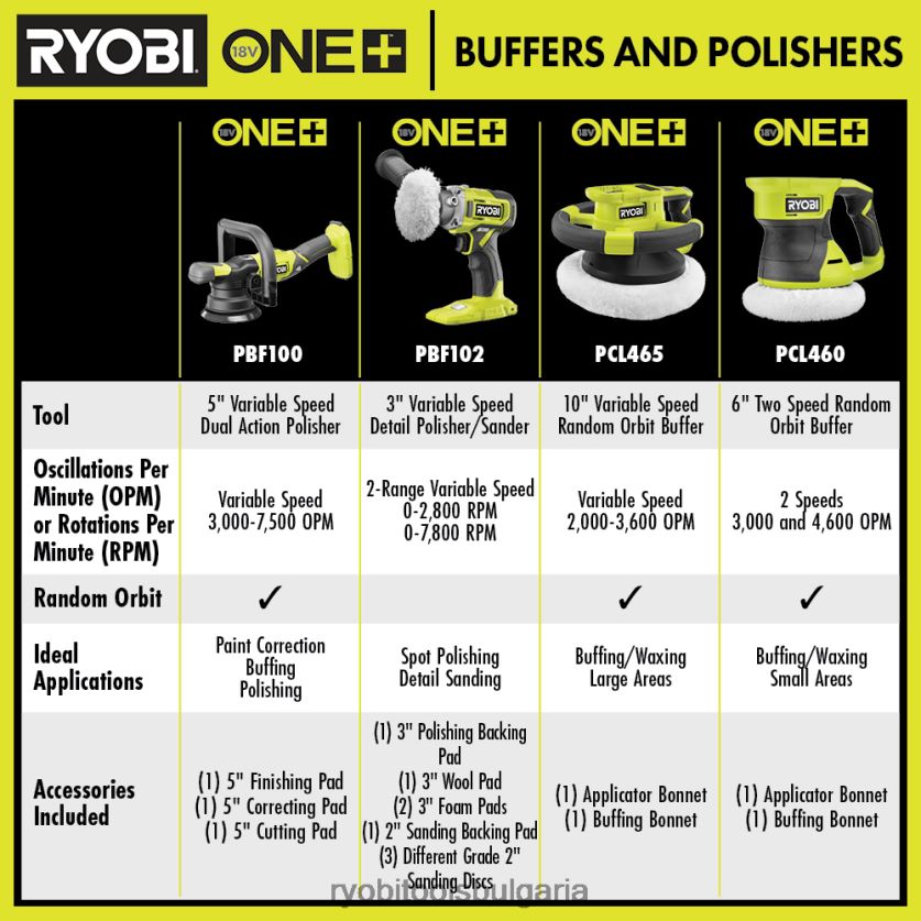 разширете своята система ryobi 18v one+ с 18v one+ 10” буфер с произволна орбита с променлива скорост. предназначен да се справя с големи повърхности, този инструмент има способността да полира превозно средство в пълен размер с до 2-1/2 часа работа. дискът с променлива скорост осигурява по-голям контрол до 3600 opm, а движението в произволна орбита осигурява завършек без завихряне. изпълнявайте различни проекти по-лесно с дизайна с множество ръкохватки за максимален комфорт и контрол. Най-доброто от всичко е, че е част от системата ryobi 18v one+ от над 280 безжични продукта, които работят на една и съща платформа за батерии. този 18v one+ 10” орбитален буфер с променлива скорост е подкрепен от 3-годишна гаранция на производителя на ryobi и включва (1) pcl465 18v one+ 10” буфер с произволна орбита с променлива скорост, капак на апликатора, капак за полиране и оп.ръководство на оператора. батерията и зарядното се продават отделно.